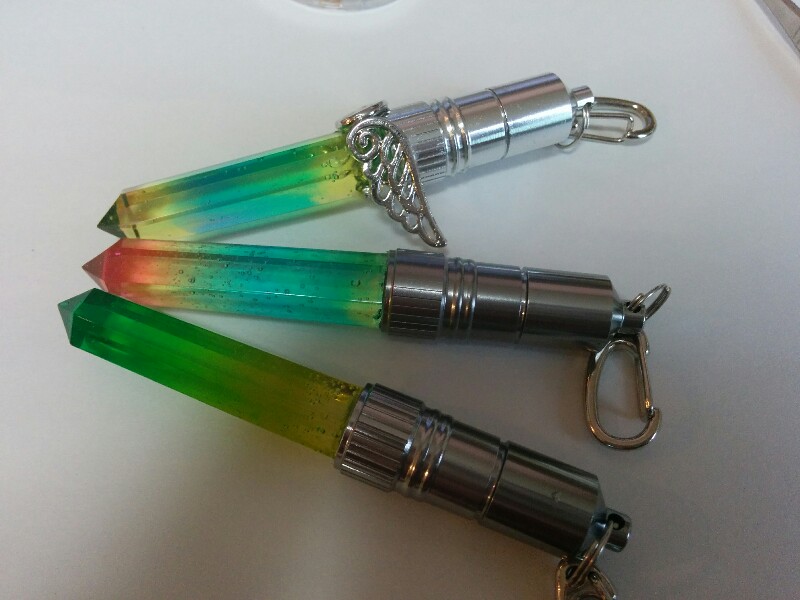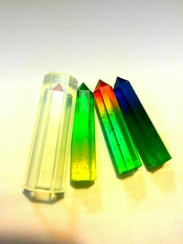 201607/07 クリスタルポイント レジン 0 クリスタルポイントのレジン型をgetしたので試作で色んな色をまぜて作ってみました♪ そしてライトを下につけたので光ります! 光ると色が変わるのでとても綺麗です。 試作なので気泡がいっぱい入っているけど、ライトをつけると気泡もキラキラ光るのでとても綺麗なのです。 今度はもう少し中に何か入れてみようかなぁ?と考えております。 クラスターみたいにいっぱい作って連結させるのも面白うそうだなぁ・・・